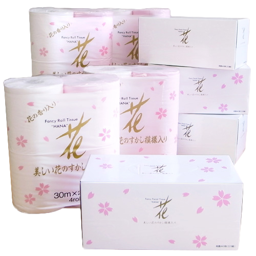 土佐和紙伝統工法を用いた美しい花の透かし模様入りの人気商品である花シリーズの 華やかなフローラルの香りのトイレットロールとボックスティッシュが入ったギフトセットです。 RはトイレットロールのR、BはボックスティッシュのBです。 花ゴールドのトイレットペーパーとボックスティッシュを詰合せたティッシュギフトは選べる3種類。 R4&R4はトイレットロールとボックスティッシュが4つずつ、R6&B6は6つずつ、R8&B8は8つずつ入っています。 誰もが使うティッシュだからこそ、贈る人を選ばない、どなたにも喜ばれるようなティッシュギフトです。 あなたの大切な人に上品なギフトセットはいかがでしょうか。